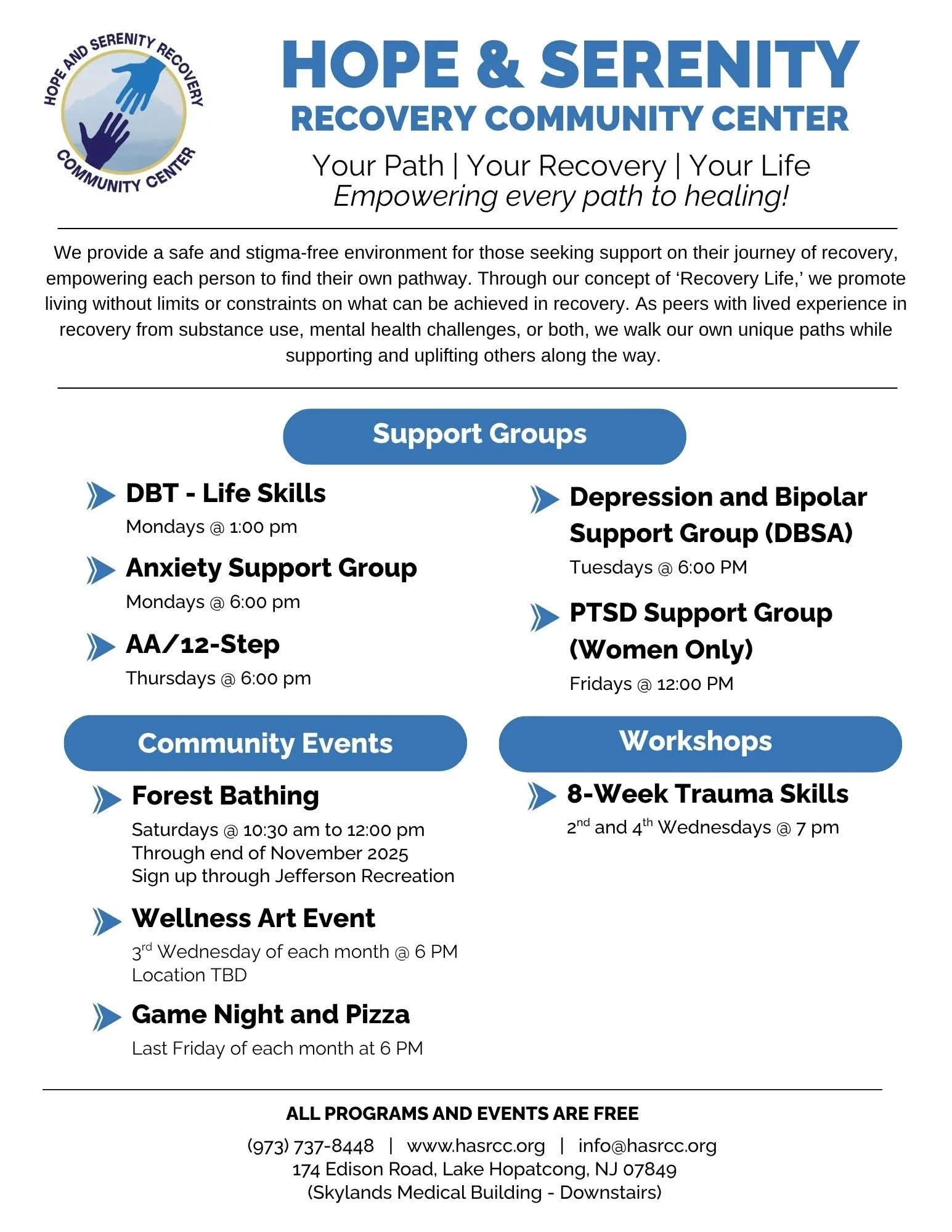 PTS & Trauma Mixed Group- The 2nd and 4th Wednesday of each month. 7PM at 174 Edison Rd. Jefferson, NJ Contact rcubby@hasrcc.org for more information