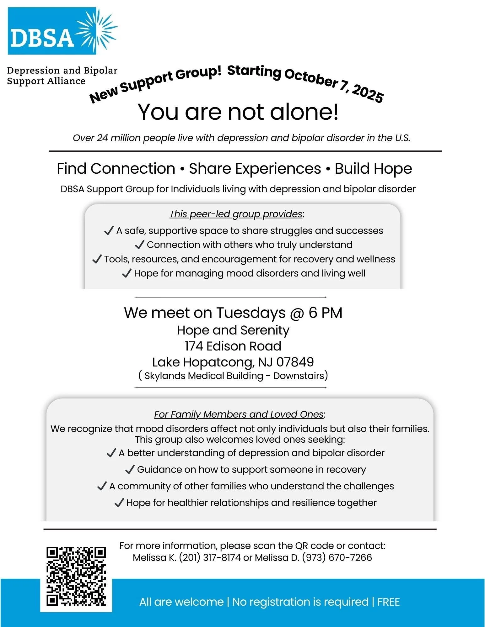 Depression & Bipolar Support Alliance - Every Tuesday at 6pm in-person at 174 Edison Rd. Lake Hopatcong, NJ