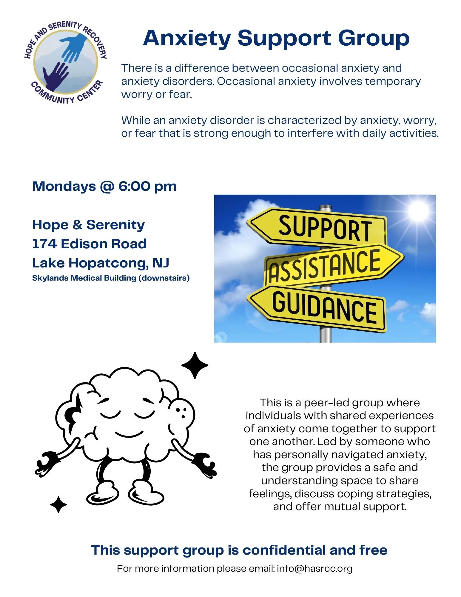 Anxiety Support Group - Every Monday at 6pm in-person at 174 Edison Rd. Lake Hopatcong, NJ